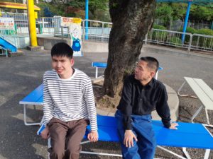 4月17日に外出で華蔵寺公園に桜を見に行きました。お花見の準備として利用者様とスマークへお菓子やドーナツを購入しに行きました。皆様楽しそうに選んでおり、何を買おうか悩まれている方もいらっしゃいました。お買い物を済ませ華蔵寺公園に移動し、日当たりの良い場所で購入した物を美味しそうに食べられておりました。桜はかなり散ってしまっていましたが、所々に満開に近い木もあり花見を楽しまれていました。食後は華蔵寺公園のアトラクションで遊びました。皆様満足そうにして帰りの車では「楽しかった」「また行きたい」と楽しそうに話されており、企画して良かったと感じました。