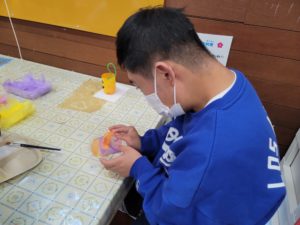 ペットボトルを使って、オレンジや黄色の花紙を貼りつけ、自分だけのかぼちゃを作りました。
